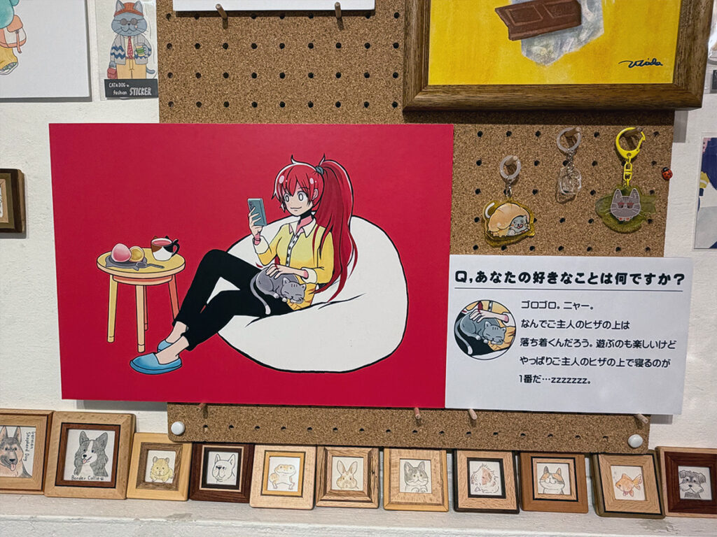 イラストの横には、飼い主と一緒に映っている動物たちの好きなことが書かれたパネルが展示されています!