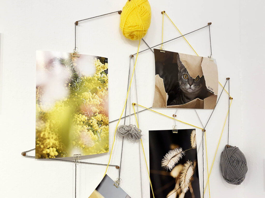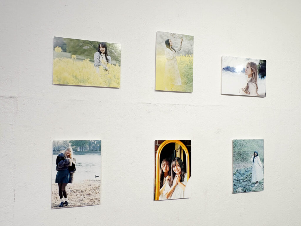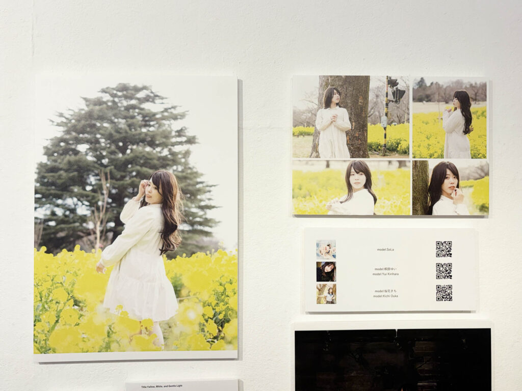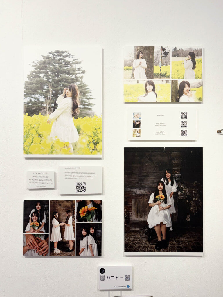 菜の花畑の春らしい写真と、双子のような二人組の、シックな雰囲気の写真を展示されているハニトーさん。