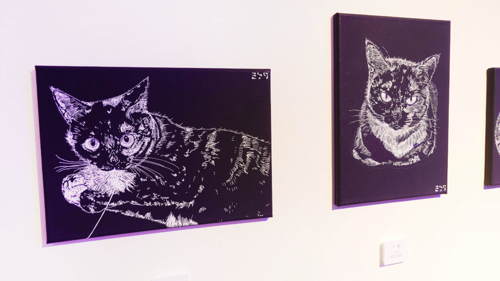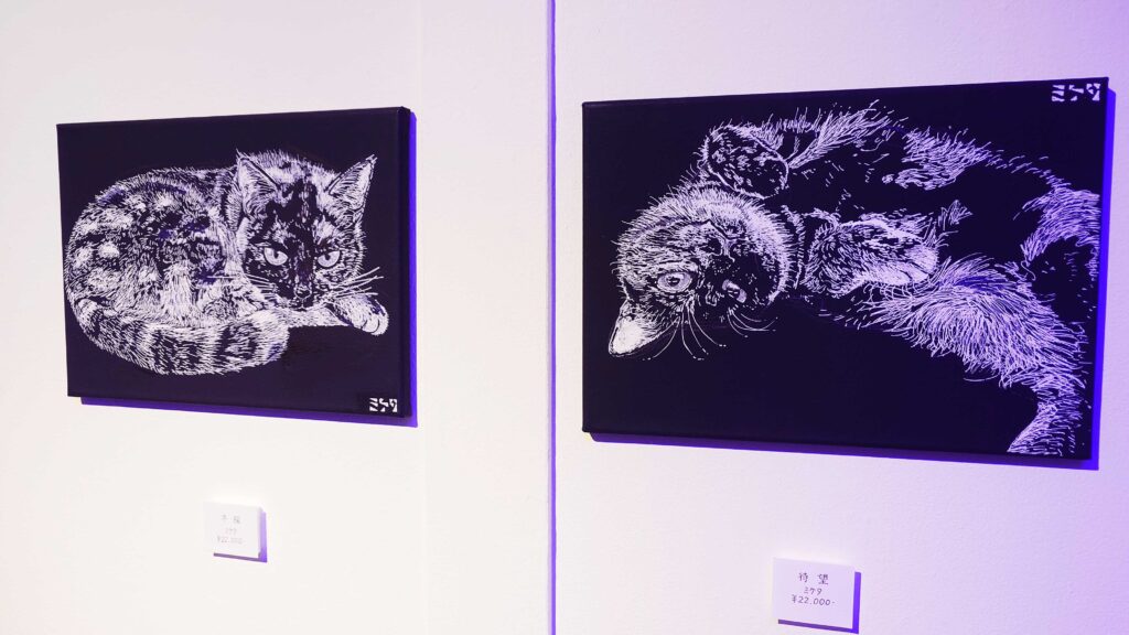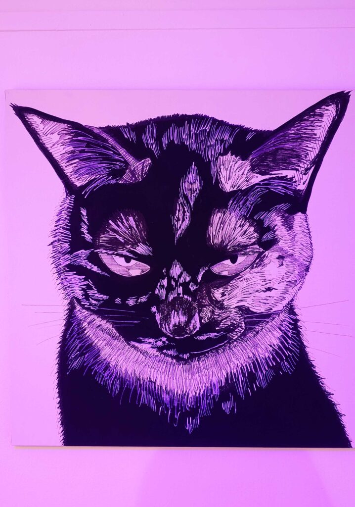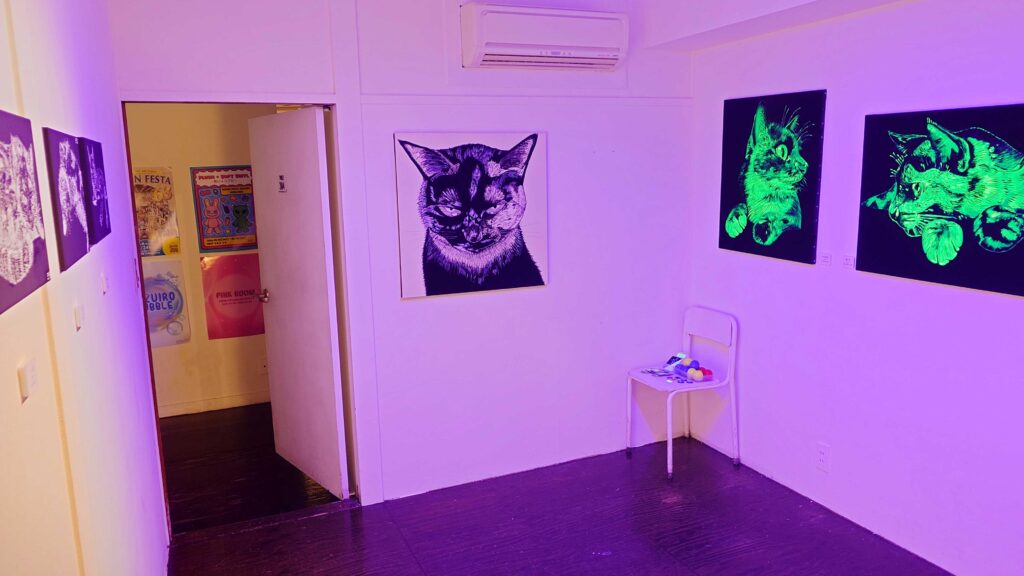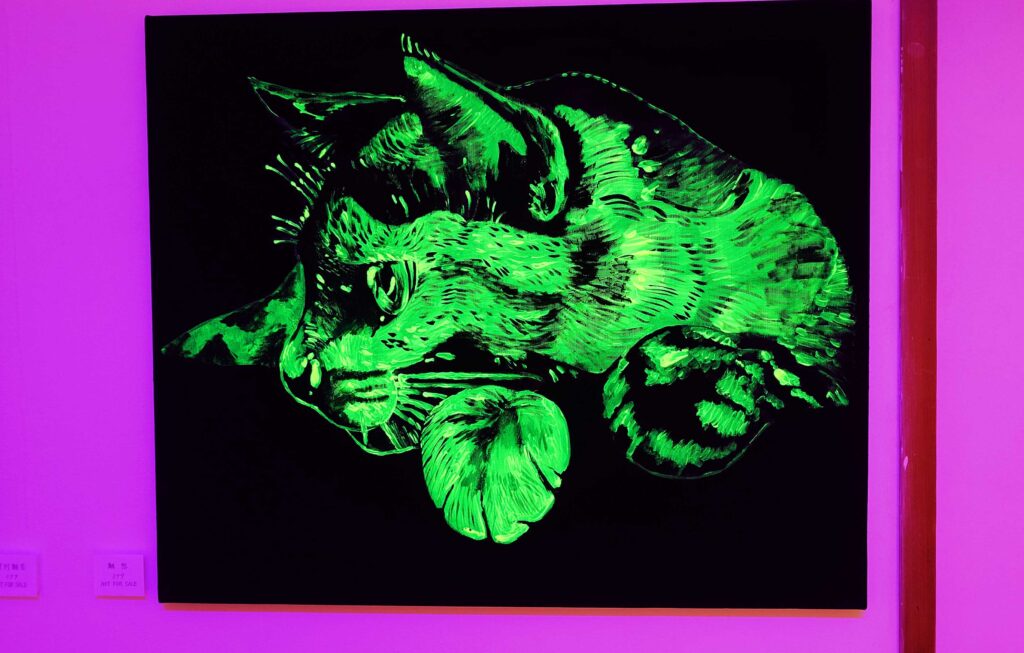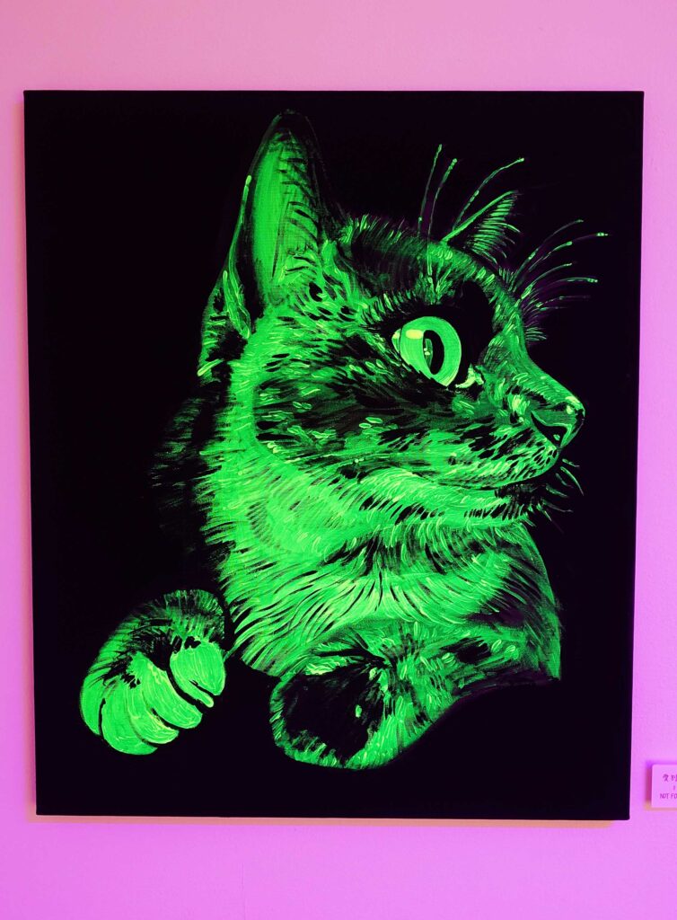 ブラックライトで強調された鮮やかな蛍光緑の猫が脳裏に焼きつきます!