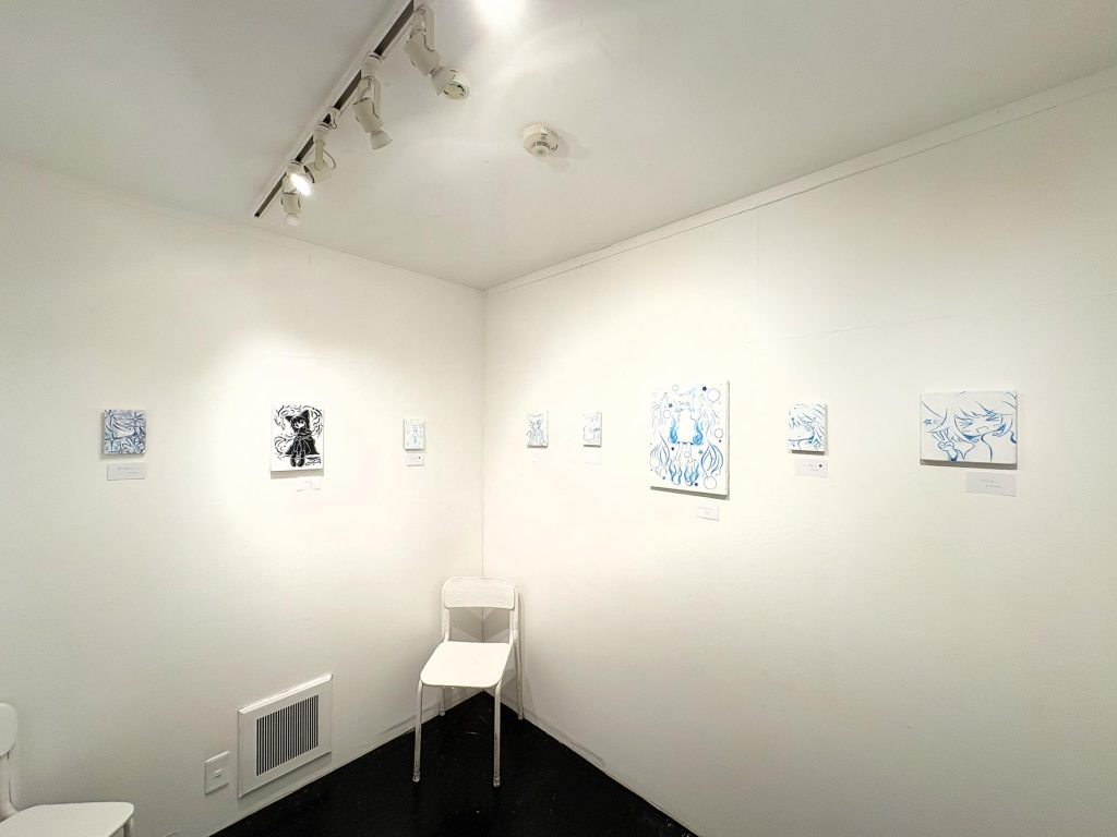 うおずみさんの作品はおもに青と白で構成され、穏やかに流れる線が心地良い。