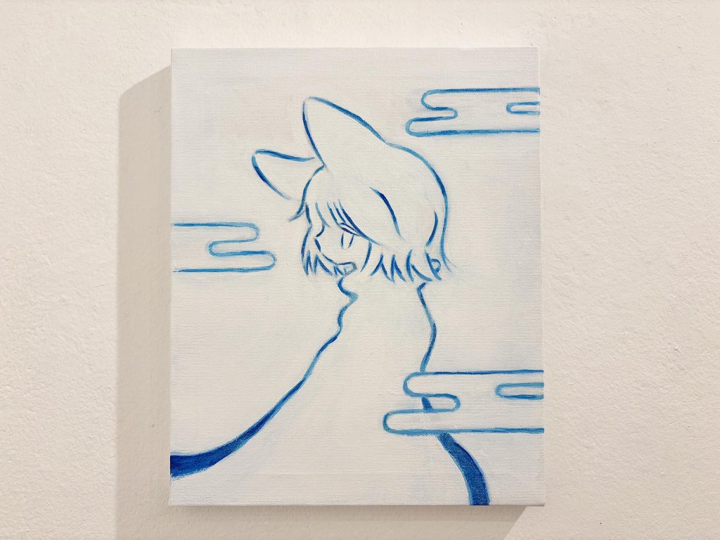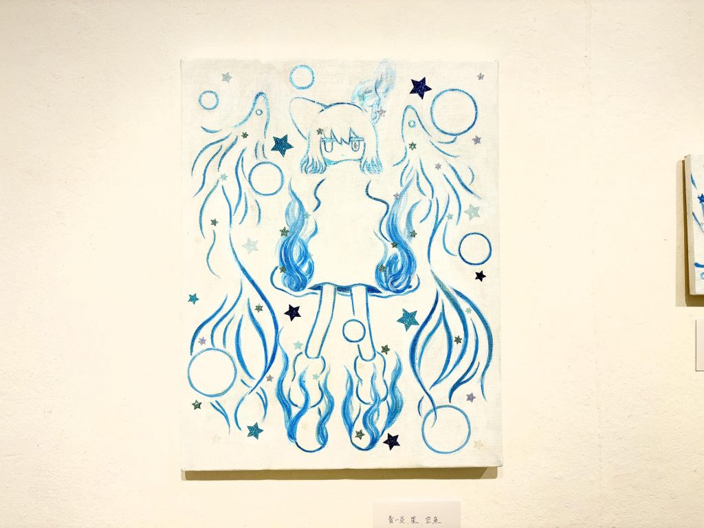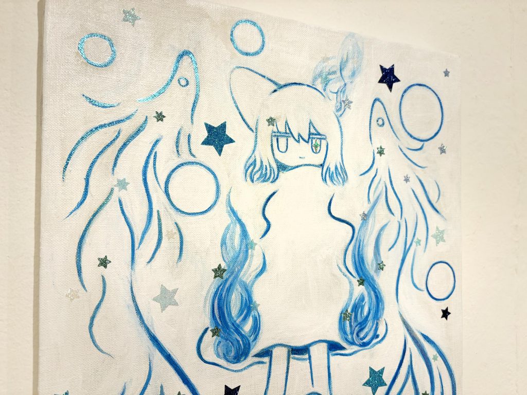 うおずみさんの作品はおもに青と白で構成され、穏やかに流れる線が心地良い。