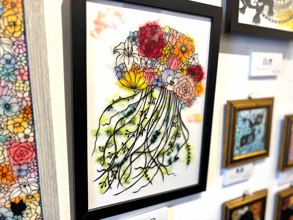 集中力が必要とされる切り絵、優雅に泳ぐクラゲやクジラなどをモチーフに市松模様などの和柄が施され、